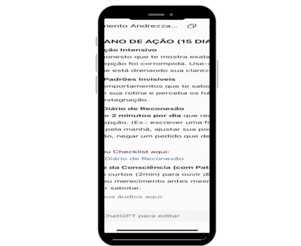 Você recebe seu plano de ação com uma lista de tarefas práticas, prazos exatos: em áudios e mensagens. É seguro. É rápido. É sob medida. E começa a funcionar no exato dia em que você acessar.